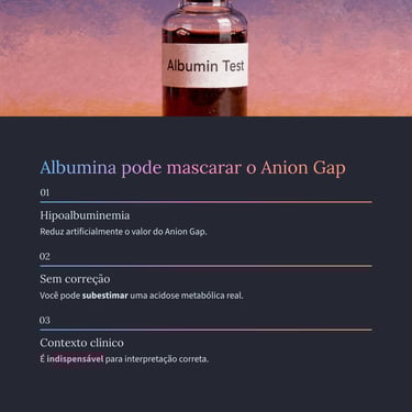 Na prática laboratorial, calcular o Anion Gap não basta. A verdadeira diferença está na interpretação clínica cuidadosa, considerando variáveis que podem mascarar ou distorcer o resultado. Dois pontos merecem atenção especial: a correção para albumina e as interferências pré-analíticas e metodológicas.