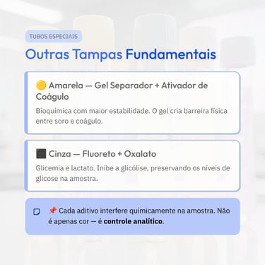A coleta de sangue é um procedimento padronizado, e cada tubo de coleta foi desenvolvido com uma finalidade específica. As cores das tampas identificam o tipo de aditivo presente no tubo (ou sua ausência), que pode interferir diretamente nos resultados laboratoriais. Por isso, o uso correto desses tubos é uma etapa essencial no processo pré-analítico das análises clínicas.