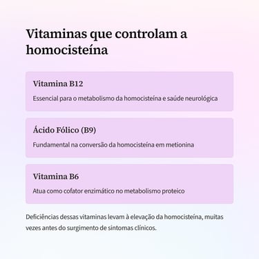 Ambos os caminhos dependem diretamente de vitaminas do complexo B, especialmente ácido fólico (B9), vitamina B12 e vitamina B6. Quando há deficiência dessas vitaminas, alterações genéticas ou sobrecarga metabólica, a homocisteína se eleva.