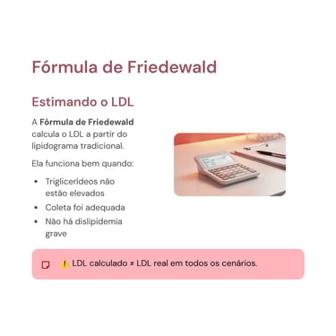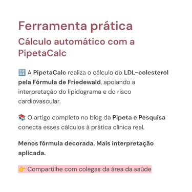 Para reduzir erros manuais e padronizar a interpretação, a PipetaCalc disponibiliza o cálculo automático do LDL-colesterol, utilizando a Fórmula de Friedewald, além de apoiar a análise integrada do perfil lipídico.
