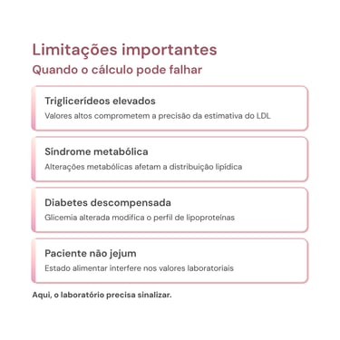 Aqui entra um ponto crítico para o laboratório: a Fórmula de Friedewald perde confiabilidade em cenários bem específicos. Quando os triglicerídeos estão elevados, quando há hiperlipidemias mistas, quando o paciente não realizou jejum adequado, ou ainda em contextos de diabetes descompensada e síndrome metabólica importante, a estimativa do LDL passa a ficar menos precisa. Nesses casos, o LDL calculado pode ser subestimado ou superestimado, levando a interpretações equivocadas se o resultado for analisado sem ressalvas e sem correlação clínica.