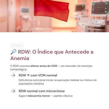 Esse índice é especialmente interessante por indicar mudanças precoces no perfil hematológico. Um RDW aumentado, mesmo com VCM normal, pode ser um dos primeiros sinais de uma deficiência nutricional, antes que a anemia se instale completamente.
