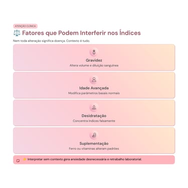 Dois pacientes com os mesmos índices hematimétricos podem ter desfechos clínicos completamente diferentes. Uma gestante com CHCM reduzido deve ser avaliada com cuidado, pois há maior risco de complicações perinatais. Já um idoso assintomático com RDW levemente aumentado pode simplesmente estar diante de uma variação fisiológica da idade.