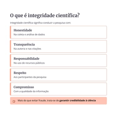 Integridade científica envolve honestidade intelectual, atribuição correta de créditos, respeito aos participantes da pesquisa, zelo com os dados, observância das normas éticas e legais, responsabilidade na supervisão acadêmica, transparência nas relações institucionais e compromisso com a qualidade da informação produzida e divulgada. Essa visão aparece com clareza na nova política do CNPq, que incorporou o Código de Conduta do órgão e passou a organizar esses deveres em dez princípios, incluindo honestidade, veracidade na autoria, respeito à diversidade, inclusão, justiça social e responsabilidade em todas as fases da pesquisa.