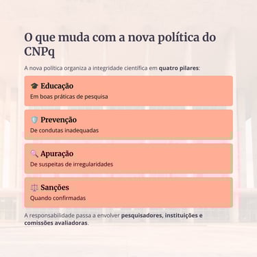 Foi nesse contexto que o CNPq instituiu, por meio da Portaria nº 2.664, de 6 de março de 2026, a Política de Integridade na Atividade Científica, anunciada oficialmente em 11 de março de 2026. A nova política busca garantir integridade em todas as atividades científicas apoiadas pelo Conselho e se aplica a servidores, proponentes, beneficiários, avaliadores e usuários das plataformas e serviços digitais do órgão. Segundo o CNPq, a política foi construída com base em quatro eixos: educação, prevenção, apuração e sanção.