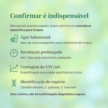 Quando a hipótese diagnóstica estiver entre contaminação e candidúria verdadeira, reavalie parâmetros pré-analíticos e correlacione com aspecto/colorimetria, pH/densidade e eventuais cristais e cilindros, ajudam a fechar a interpretação integrada.