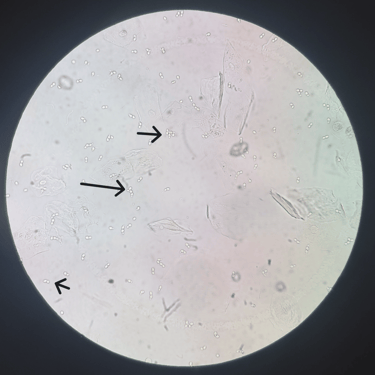 No exame de urina tipo I, as leveduras podem ser visualizadas ao microscópio como estruturas ovais ou arredondadas, com parede espessa, podendo apresentar brotamentos (blastoconídios).