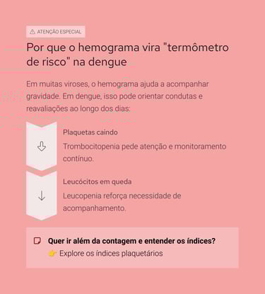 Em outras palavras: na dengue, o hemograma não entra só para “confirmar”; ele ajuda a acompanhar o curso da doença e a identificar sinais de alerta laboratoriais mais cedo.