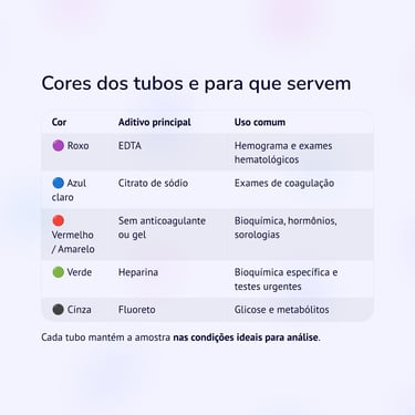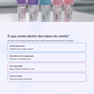 Cada tubo mantém a amostra nas condições ideais para determinados exames, evitando interferências e garantindo resultados confiáveis.