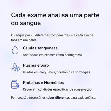 Esses componentes garantem que o sangue seja processado da forma correta para cada tipo de exame.