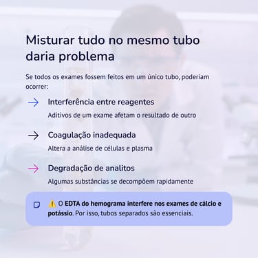 Por exemplo, o EDTA, usado no hemograma, interfere em exames de cálcio e potássio.
