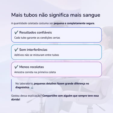 O laboratório segue protocolos técnicos para garantir a qualidade da análise. Reduzir o número de tubos pode comprometer exames ou gerar necessidade de nova coleta.
