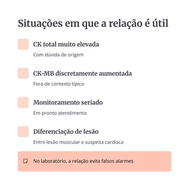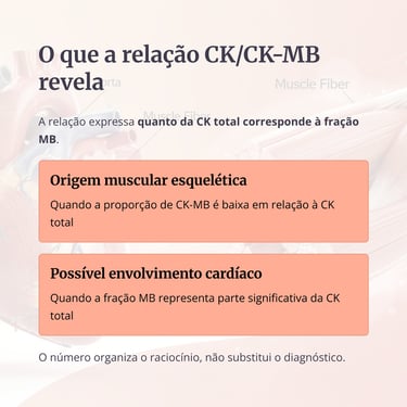 A relação CK/CK-MB ajuda a diferenciar a origem da elevação da creatina quinase, indicando se o aumento está mais associado ao músculo esquelético ou ao músculo cardíaco. Quando interpretada em conjunto com o quadro clínico, tempo de evolução e outros marcadores, ela reduz erros diagnósticos e evita conclusões precipitadas no laboratório.