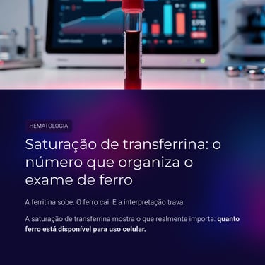 Enquanto a ferritina reflete reserva corporal, a saturação mostra quanto ferro está realmente acessível para uso celular. Essa diferença é determinante na investigação das anemias e nos distúrbios do metabolismo do ferro.