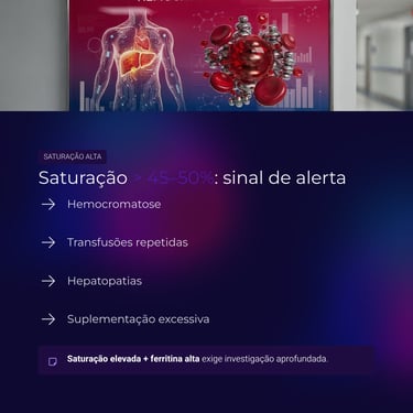 Saturação elevada + ferritina alta exige investigação cuidadosa.