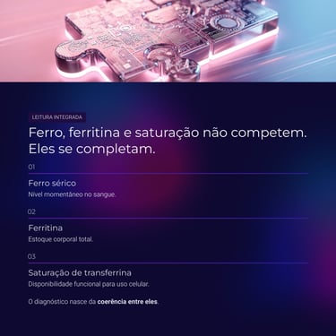 A saturação de transferrina conecta esses dois dados, oferecendo uma leitura mais funcional da disponibilidade de ferro para os tecidos.